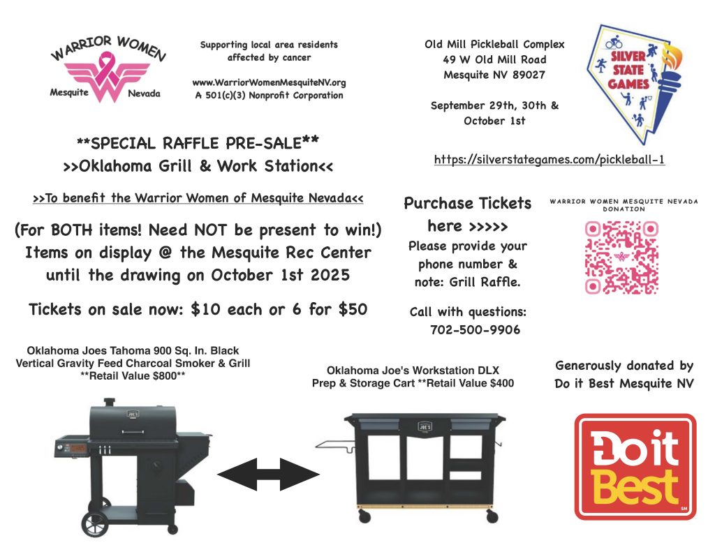 The Silver State Games Pickleball Tournament will be held in Mesquite Nevada September 29-October 1. The Games are donating ALL proceeds from their raffles for this event to the Warrior Women of Mesquite Nevada.