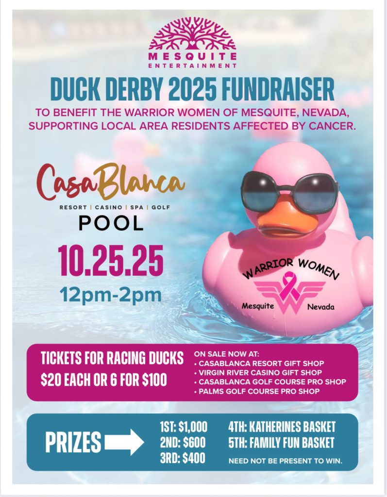 The Warrior Women of Mesquite Nevada will have a table at this event. Please stop by and see us! Purchase your Duck Derby tickets here!